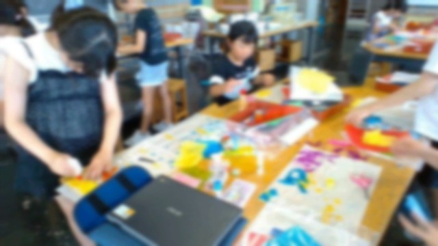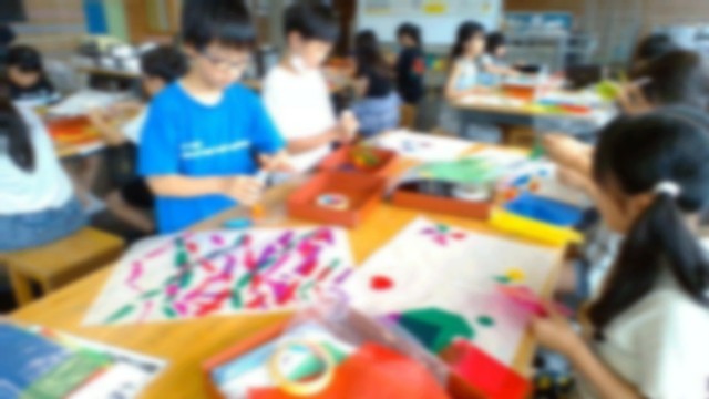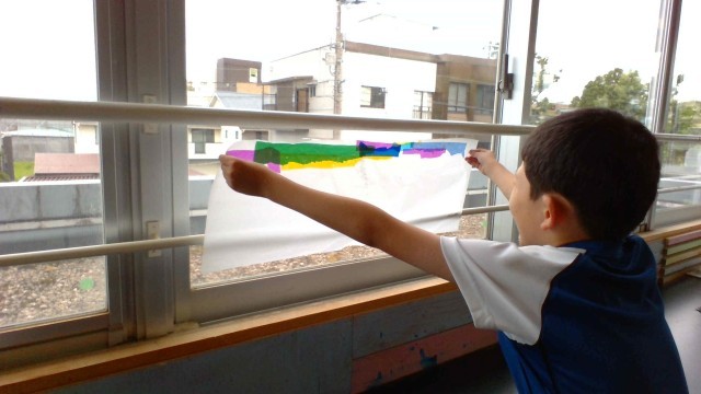 図画工作科で「光のさしこむ絵」という学習をしています。光を通した時の色の重なりの美しさを感じながらイメージを広げていました。時折光を通した時の感じを確かめながら、楽しくつくっています。