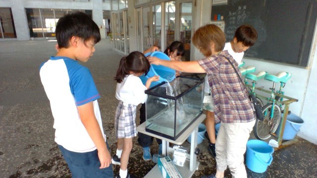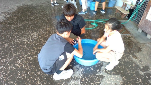 飼育栽培委員会は、校務センター前のメダカの水槽の掃除に協力しながら取り組んでいました