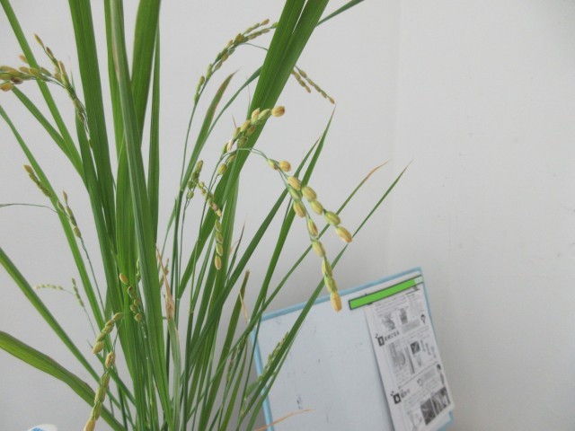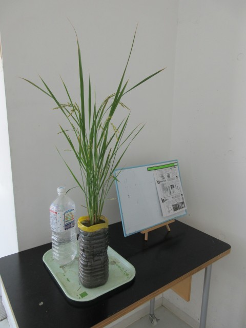 5年生の教室横に、栽培してきた稲が紹介されています。