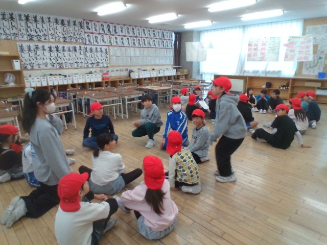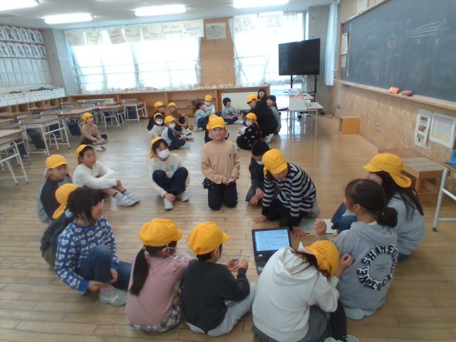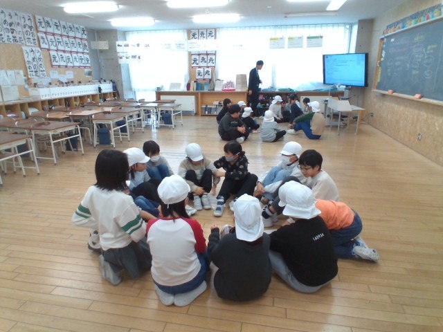 にじいろ班活動の2学期の振り返りをしました。班ごとに円になり、そうじや運動会で協力できたこと、一緒に遊んで楽しかったこと、がんばっていた人や班の仲間のいいところなどについて一人一人思いを伝え合いました。人権週間とも合わせて、仲間のよさを認め合い絆を深めていきたいです。振り返りの後は、集会委員会おすすめの遊びを参考にしながら、班ごとに仲良く遊びました。