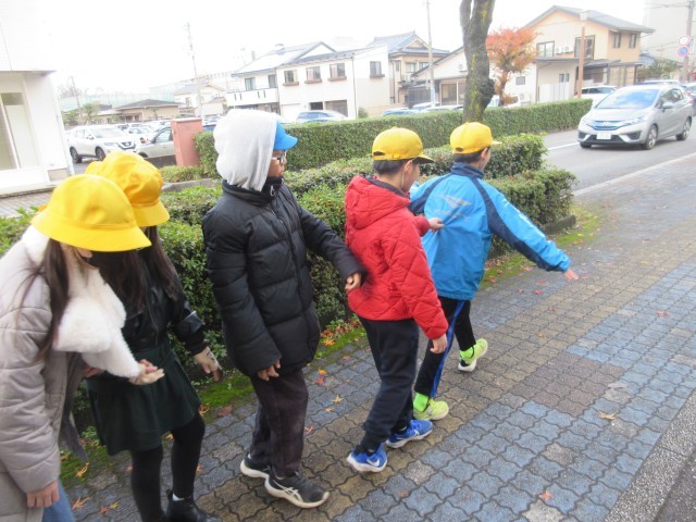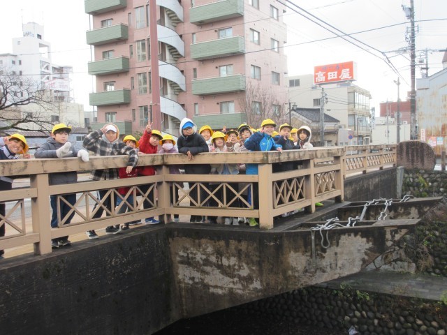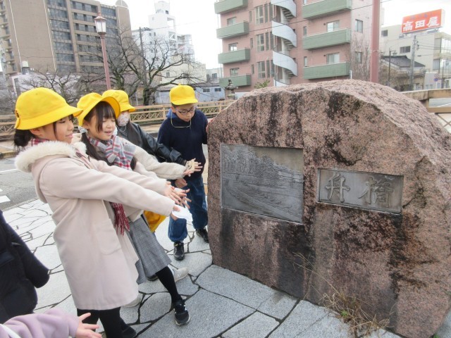 4年生は社会科の学習で神通川の治水について学習しました。資料に出てくる舟橋の跡地が校区にあり、実際に見に行きました。舟橋だった場所には、地面に船の形の模様が残されています。細くなった神通川は「松川」となり、その船には、当時の舟橋の形やつながれていた鎖もありました。資料集で見たことと実際の舟橋を比べながら、模様の上を落ちないように歩きながら「こんなに広い川だったんだな」とその大きさを体感していました。