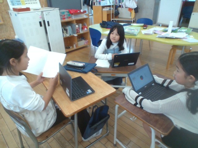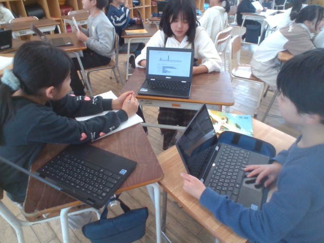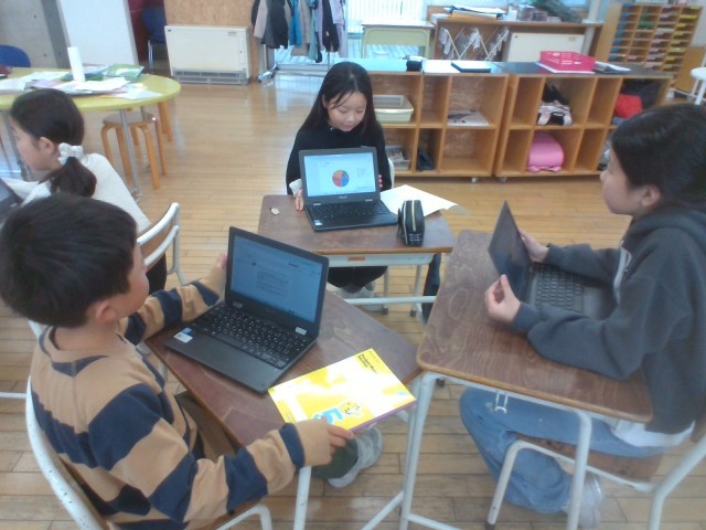 4年生は、国語科で、学級の仲間に生活に関するアンケートを取り、それを分析して考えたことを伝え合う「生活調査隊」という学習を行っています。各クラスで、調べたことを、違うクラスの同じ出席番号の人たちで伝え合い、各クラスの特徴を比べたりつなげたりして話し合うことをまとめとしました。自分たちの調べたことを伝えるだけではなく、自分の学級とつなげて、質問をしたり、感想を伝えたりして、聴き合いました。調査結果のグラフを見せながら、相手の目を見て話したり、体が思わず前のめりになって、相手の話を真剣に聞く姿がありました。学級の枠を超えて、学年の仲間と関わることで新しい発見や気付きがありますね。