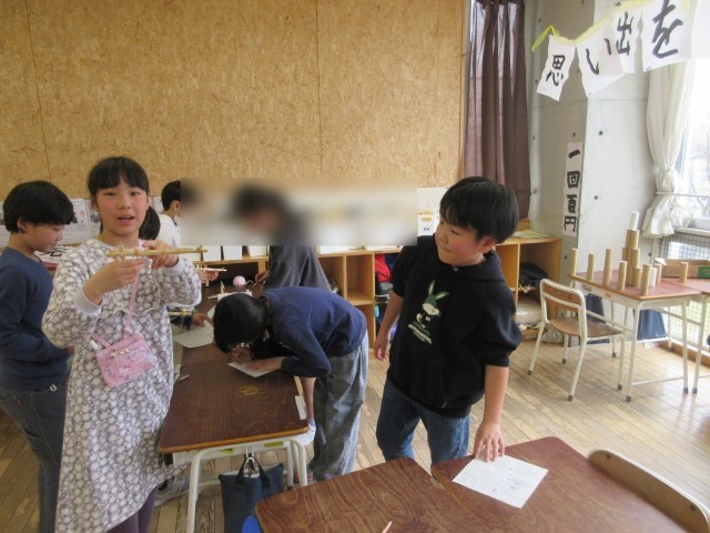 各クラスで、1年間の振り返りと思い出に、学級集会が行われました。春祭りを企画したクラスでは、でんぷんのりで書いた文字が、うすめたうがい液につけると、文字が浮かび上がる、化学反応を用いた「水みくじ」や、春らしい食べ物屋さん、射的などそれぞれの工夫がいっぱいのお店でお祭り気分を楽しみました。手書きの通帳でお金を増やしたり使ったりできる仕組みも考えて、一人一人のアイディアや工夫が、みんなの笑顔につながる楽しい集会になりました。ドッジボールや椅子取りゲームなどみんなで楽しむ遊びもあり、それぞれのクラスごとに、友情を深め合いました。