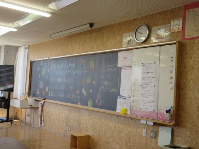 各クラスの黒板には、子どもたちへの担任からのメッセージが描かれています。