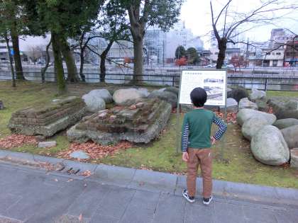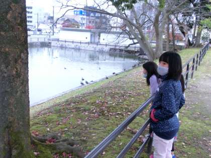 芝生広場から少し離れて公園を散策してみると、お堀にはカモが泳いでいたり、昔の建物の跡があったりと、城址公園の「すてき」がさらに見つかりました。