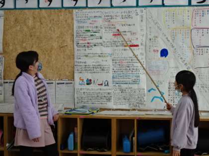 各チームの新聞が出来上がり、いよいよ発表です。それぞれ調べてきたことや、自分の考えたことを、工夫して発表しています。発表を聞いて、質問をしたり、発表のよさを見付けて伝えたりしていました。