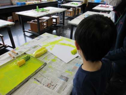 今日は、白い画用紙にローラーで3色の線を描きました。線の向きや色の組み合わせを考えながらローラーを転がしました。