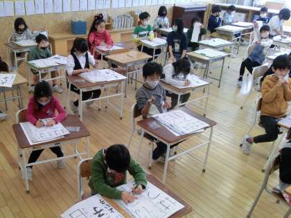 書写の学習で、書き初めの練習に取り組んでいます。手本を見て始筆の位置を確かめたり、文字の形や大きさに気を付けたりしながら、一生懸命練習しました。