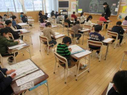 静まりかえった各教室で、一筆入魂。練習の成果を発揮しようと、真剣に取り組んでいました。