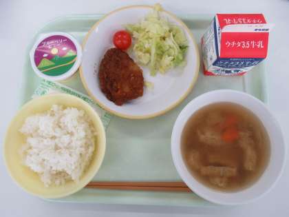 とんかつはソースがかかって甘辛く味付けしてあり、添えられたゆでキャベツとの相性抜群でした。子供たちは、夜空に月が浮かぶ様子をイメージしたブルーベリーゼリーに大喜びでした。
