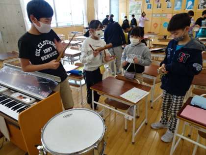 音楽科の時間に、リズムづくりの学習をしました。グループでイメージを決めて、それに合わせて楽器を選びました。4種類のリズムを組み合わせて、自分たちの演奏を考えました。