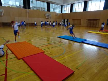 跳ぶタイミングや空中姿勢もだんだん上手になってきました。助走も、レベルアップして、3歩から、5歩、7歩と増やして行きました。高く遠くまで跳べるようになり、1枚目のマットを超えて2枚目のマットに届くくらい跳べる子も増えてきました。