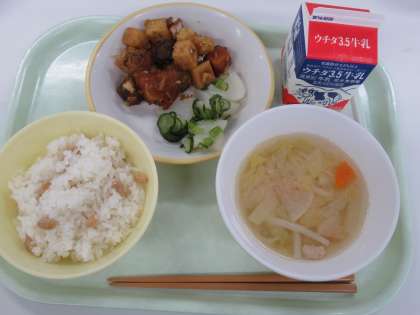 ほっぺたが落ちそうなくらいおいしい豆ご飯やすずな(かぶ)とすずしろ(大根)の旬の食材たっぷりの具だくさん汁が、寒い季節にピッタリで心も身体もぽかぽかです。