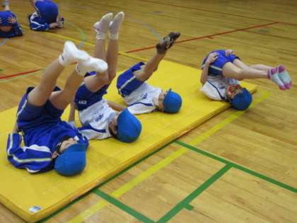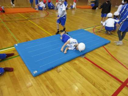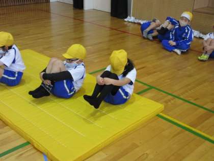 今日は、準備・片付けの仕方を知り、マットの上でいろいろな転がり方をしたり、体を支えたりしました。この後、様々な動きができるようにしたいと思います。