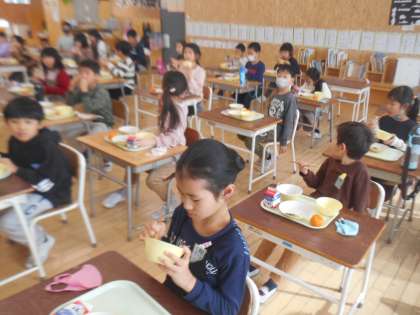 今週は給食週間です。食事のマナーや片付け方を確認したり給食カルタを書いたりしています。週間中の献立は、絵本の世界の食べ物にちなんだ特別メニューです。子供たちは毎日楽しみにしています。