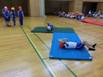 今日は「丸太ころがり」「前ころがり」「後ろころがり」「川跳び」などに取り組みました。子供たちは、体を腕で支えてマットをとび越えたり、体を回転させたりと、いろいろな動きを楽しんでいました。