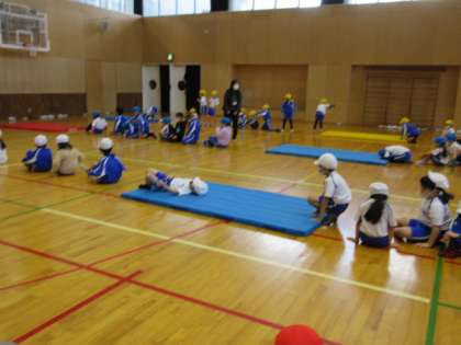 2回目は、新しく「かえるの足打ち」や「前転がり」を行いました。より多く足打ちができるように、まっすぐ回ることができるように、子供たちは夢中に練習をしていました。