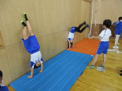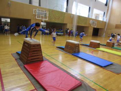 体育科では、マット運動や跳び箱運動の学習を行っています。