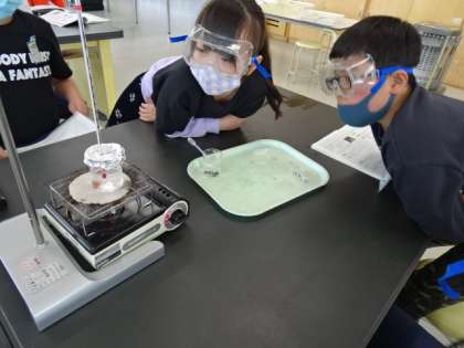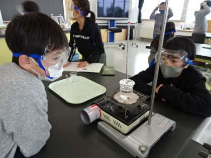 理科の学習で、水は何度で沸騰するかを調べる実験をしました。水を凍らせた時と比べて、水の変化の様子について観察しました。