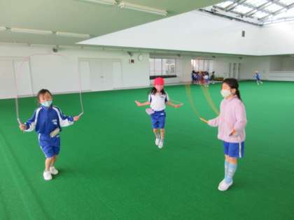 縄跳び練習では、前跳び、かけ足跳び、あやとび等が上達するように練習をしています。