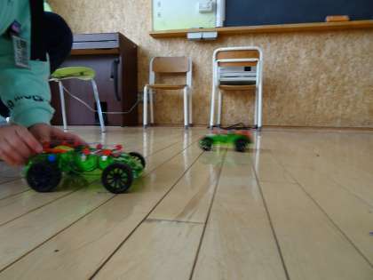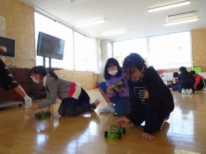 理科の学習では、電磁石を用いたモーターカーを製作しました。多目的教室でたくさん走らせることができた子供たちは、とても嬉しそうでした。