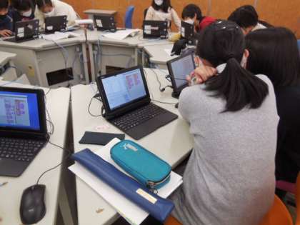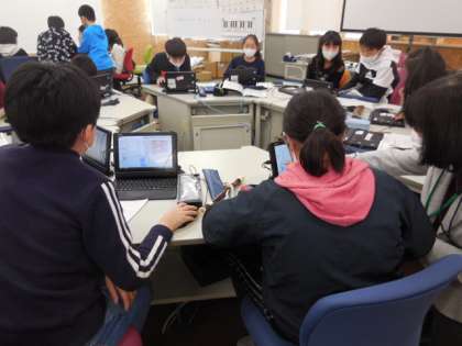 5年生は、プログラミングソフトのスクラッチを活用して、日本の音階を使った旋律づくりを行っています。音の上がり下がりを工夫しながら、いろいろな旋律をつくって試聴しました。