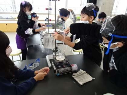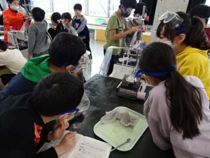 理科の学習で、水を沸騰させたときに出る泡や湯気の正体は何かについて確かめる実験をしました。水を沸騰させて出た湯気を集めると水になりました。空気だと予想していた子もいましたが、水の姿が変わっていたことに気が付きました。