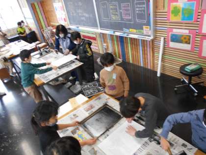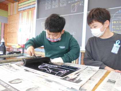 彫刻刀で彫った版木が完成し、今回はそれを紙に印刷する作業をしました。子供たちは、インクをつけた版木に紙をのせ、うまく写っているか確認しながら熱心に刷っていました。