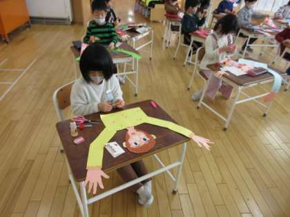 作品の服の模様を作りながら、「おめでとう」の気持ちが伝わる明るい作品にしたいと話す子どもが見られました。