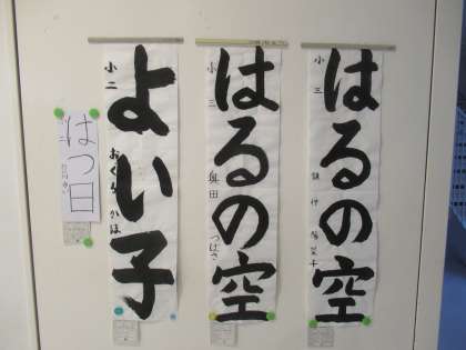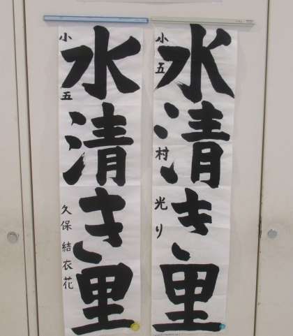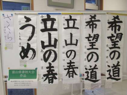 各学年2名ずつ、学校の代表として富山県書初大会に出品した作品が児童玄関に掲示してあります。どれも練習の成果が伝わる堂々とした作品で、多くの児童が作品の前で足を止め見入っています。