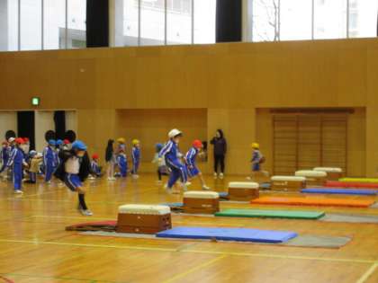 今日は、ロイター板を使ってジャンプしたり、足を揃えて着地したりする練習を行いました。リズムよく踏み切って跳び箱に乗ったり、両手をしっかりと着いてまたぎ乗ったりする練習をしていきます。