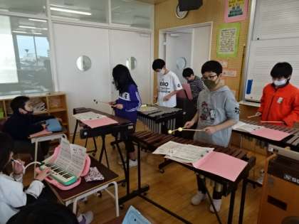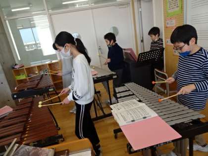 音楽科で「茶色のこびん」の合奏に挑戦しました。鍵盤ハーモニカとリコーダーに加えて、鉄琴、木琴、バスマスターの特別楽器も合わます。みんなの音をよく聞いて合奏を楽しんでいました。