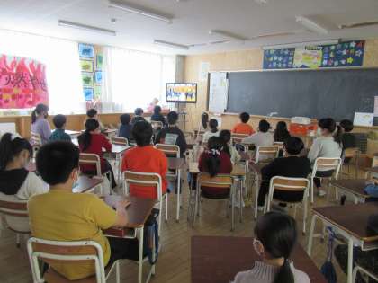 最後に5年代表児童が、「伝統を引き継ぎよりよい学校をめざしましょう」とテレビ放送で呼びかけました。視聴していた児童は真剣な態度で、よりよい学校をつくりあげようとする決意を表していました。