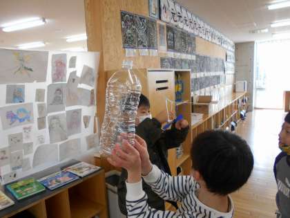 ゴムや風の働きを利用したおもちゃや電気や磁石の特徴を生かしたゲームなどを工夫しながら作っています。お互いのおもちゃを見て「もっとこうしたら楽しめるね」「ここを改良したらスムーズに動くね」など、アドバイスをし合う様子も見られます。試行錯誤しながら「おもちゃ作り」を楽しんでいます。