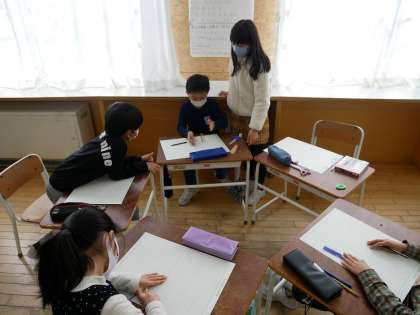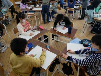 算数科の学習では直方体と立方体について勉強しています。班の友達と協力してどうやったら直方体ができるかを話し合う中で、直方体の面が6つであることや、向かい合っている面の形や大きさが同じであることに気付きました。