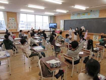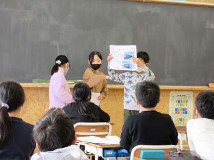 紙芝居や郷土カルタ、クイズを取り入れて紹介したり、一人一人にパンフレットを配ったりするなど、どのグループも友達に分かりやすく伝えられるように工夫した発表になっていました。