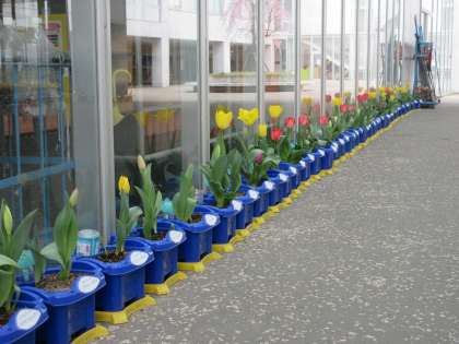 暖かい日が続いています。松川沿いの桜も見頃を迎えていますが、学校の桜も満開です。鉢植えの1年生のチューリップも咲き乱れています。この陽気で飼育小屋のグミとビスケットも元気に泳ぎまわっています。