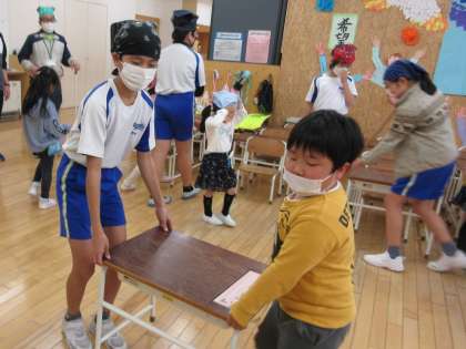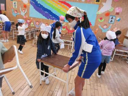清掃の時間には1年生も教室のそうじを行っています。6年生のお兄さん、お姉さんが毎日お手伝いに来ています。力を合わせてきれいにした教室で、1年生は今日もはりきって勉強をしています。そんな1年生に優しく、そして手際よく手助けをしている6年生もとても頼もしいです。