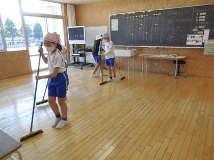 1年生の清掃手伝いも、だいぶスムーズにできるようになってきました。1年生と一緒に机を運ぶ姿や1年生のぞうきんがけを温かく見守る姿が、大変ほほえましいです。