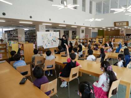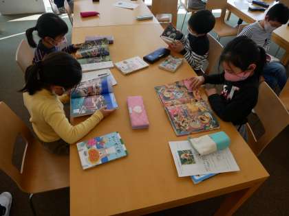 3年生になって初めての図書室利用がありました。司書の先生から図書室の利用に関するルールを改めて確認していただき、図鑑の使い方も教えていただきました。子供たちは友達と協力して、指定された植物や動物、乗り物などを、図鑑の目次や索引を使って楽しみながら調べていました。最後に本の貸し出しも行い、好きな本を借りました。子供たちは久し振りの図書室利用に嬉しそうな様子でした。