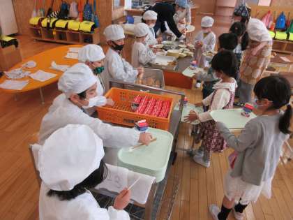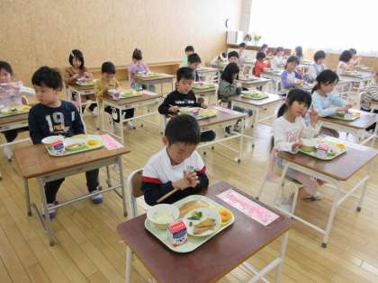 毎日楽しみにしている給食の時間です。12時に給食が運ばれてくると「今日の給食は何かな〜」とみんなウキウキ顔で準備を始めます。手洗い、消毒をしっかり行い、給食当番もとても上手に配膳をしています。食事中は静かに前を向いて食べます。おいしそうですね。