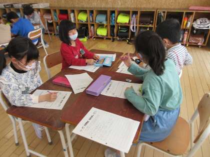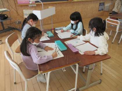 学校にある特別教室の特徴や、給食、掃除等の生活のこと、行事のことなど、自分たちが伝えられることは何か、どのように伝えるとよいかグループの人と相談しています。