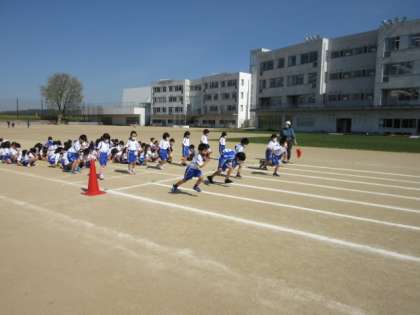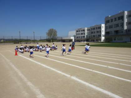 体育の学習で、50m走をしました。腕をしっかり振ることと足を上げて走ることを目当てに、一生懸命走りました。