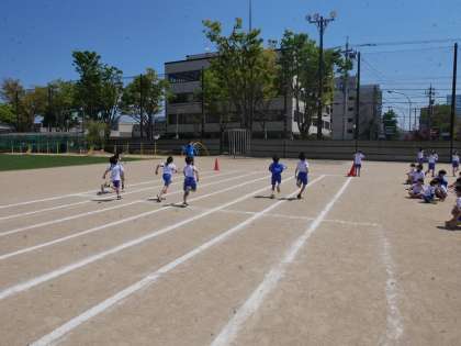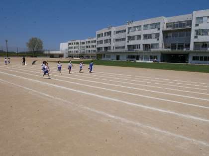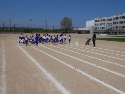 50m走のタイムを計りました。追い風のため、どの子供もとてもよいタイムが走ることができました。青空の下で走る子供たちは、とても気持ちよさそうで、全力で走ることを楽しみました。