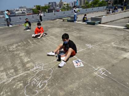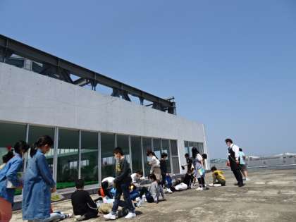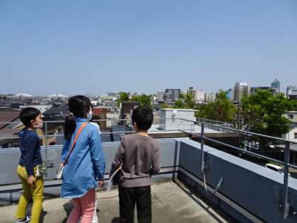 屋上に出て、天気の観測の仕方について学び実際に調べてみました。気持ちのよい青空の中、子供たちは方角を意識して「今の雲は、空の1割もないから晴れだね」とすっかり小さな気象予報士でした。