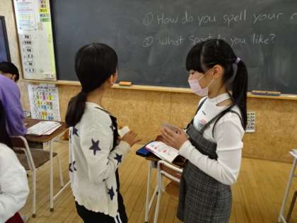 5年生になり、外国語の学習が教科としてスタートしました。英語で自分の好きなスポーツや食べ物を紹介したり、自分の名前のスペルを言ったりすることができるようになりました。