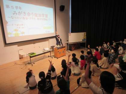 宿泊学習に向け、宿泊学習に臨む心構えや、どのような活動が予定されているか、係などの話をしました。子供たちは、話をわくわくした様子で聴いていました。また、仲間と協力しながら活動に取り組んでいくぞという気持ちを高めていました。