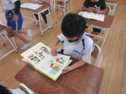 生活科で育てている野菜について、「苗が倒れないようにするにはどうすればよいか」「これからどのように育つのか」等、図書室の本を使って調べています。