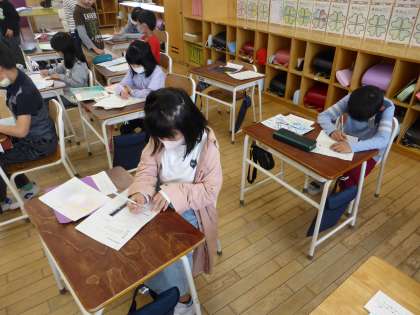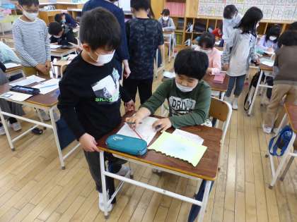 図画工作科の時間に作品の鑑賞を行いまいた。友達の作品をじっくりと見て色使いのよさや模様のおもしろさなどを感じ、互いに伝え合いました。