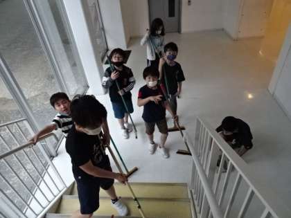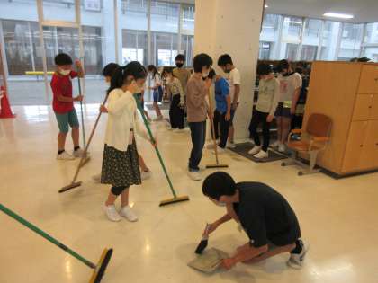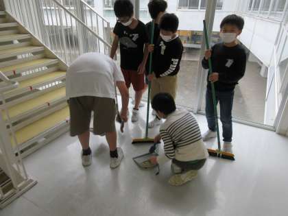 避難訓練の後、玄関で靴に付いた砂を払って教室に戻ろうとしたときです。玄関に砂がたくさん落ちていることに気付いた五年生が自ら「先生、掃除をしてもいいですか?」と掃除を始めました。それを見た5年生の子供たちは、次々自分から行動を起こし、玄関だけでなく階段や廊下もほうきで掃いたりちりとりでゴミを集めたりし始めました。